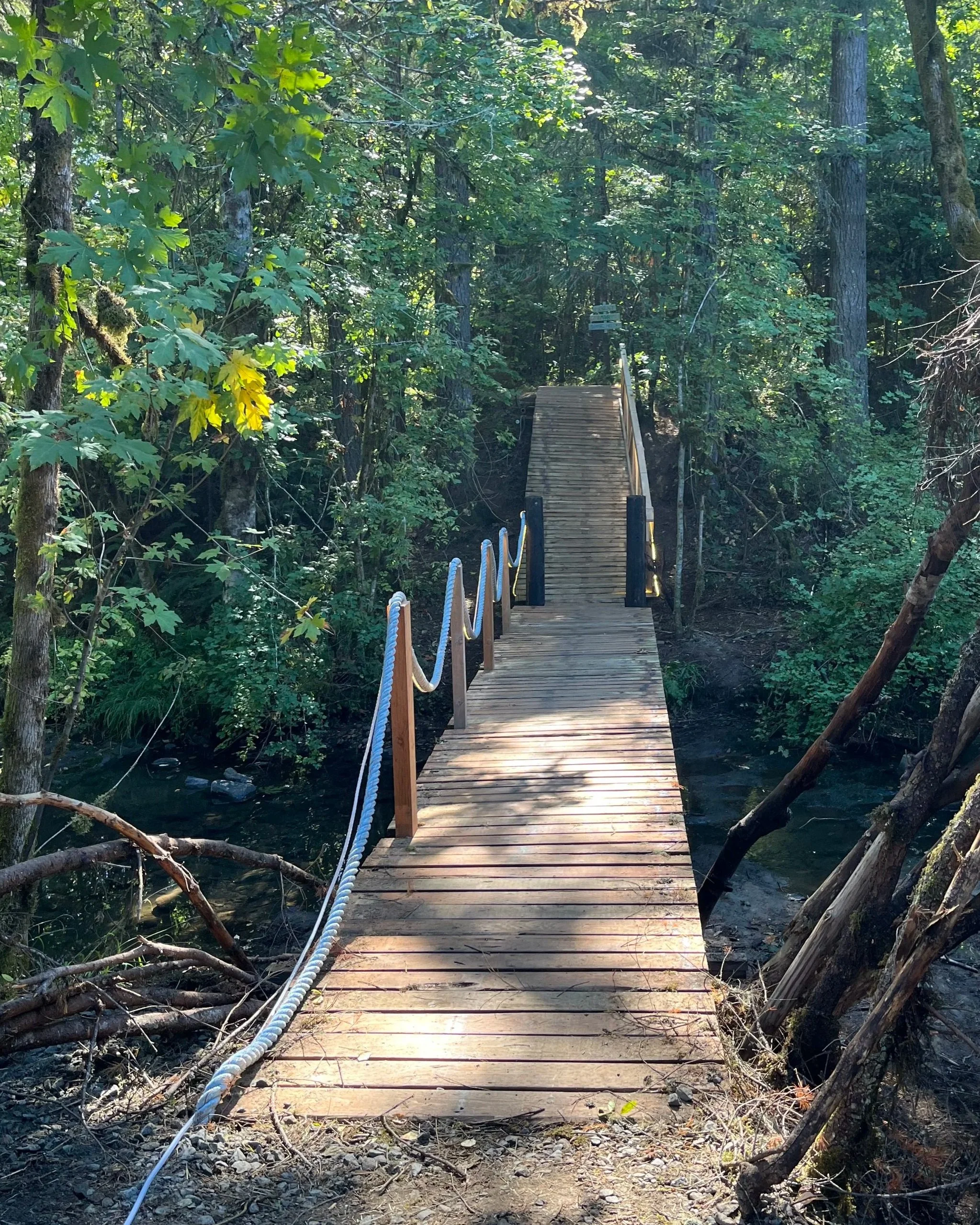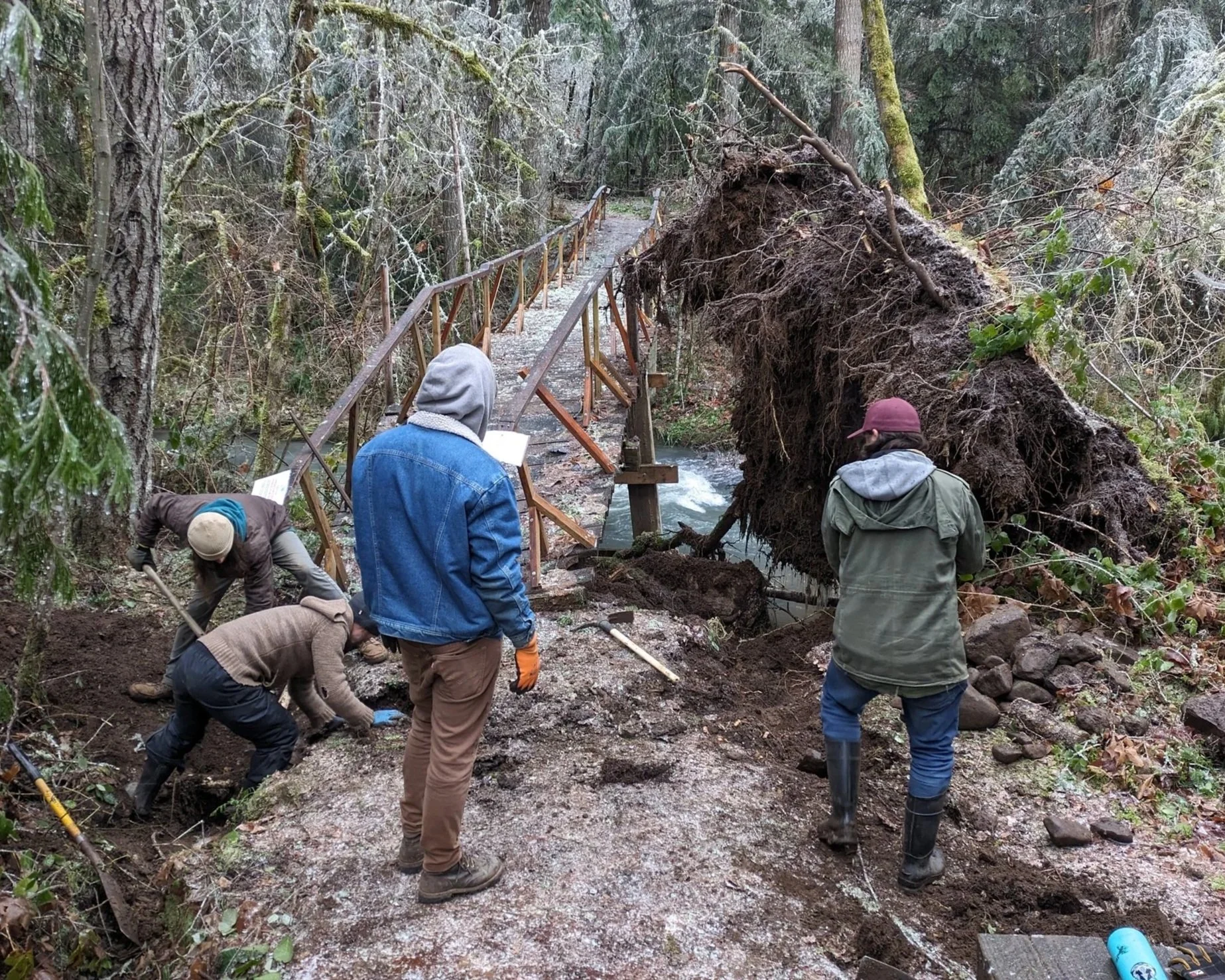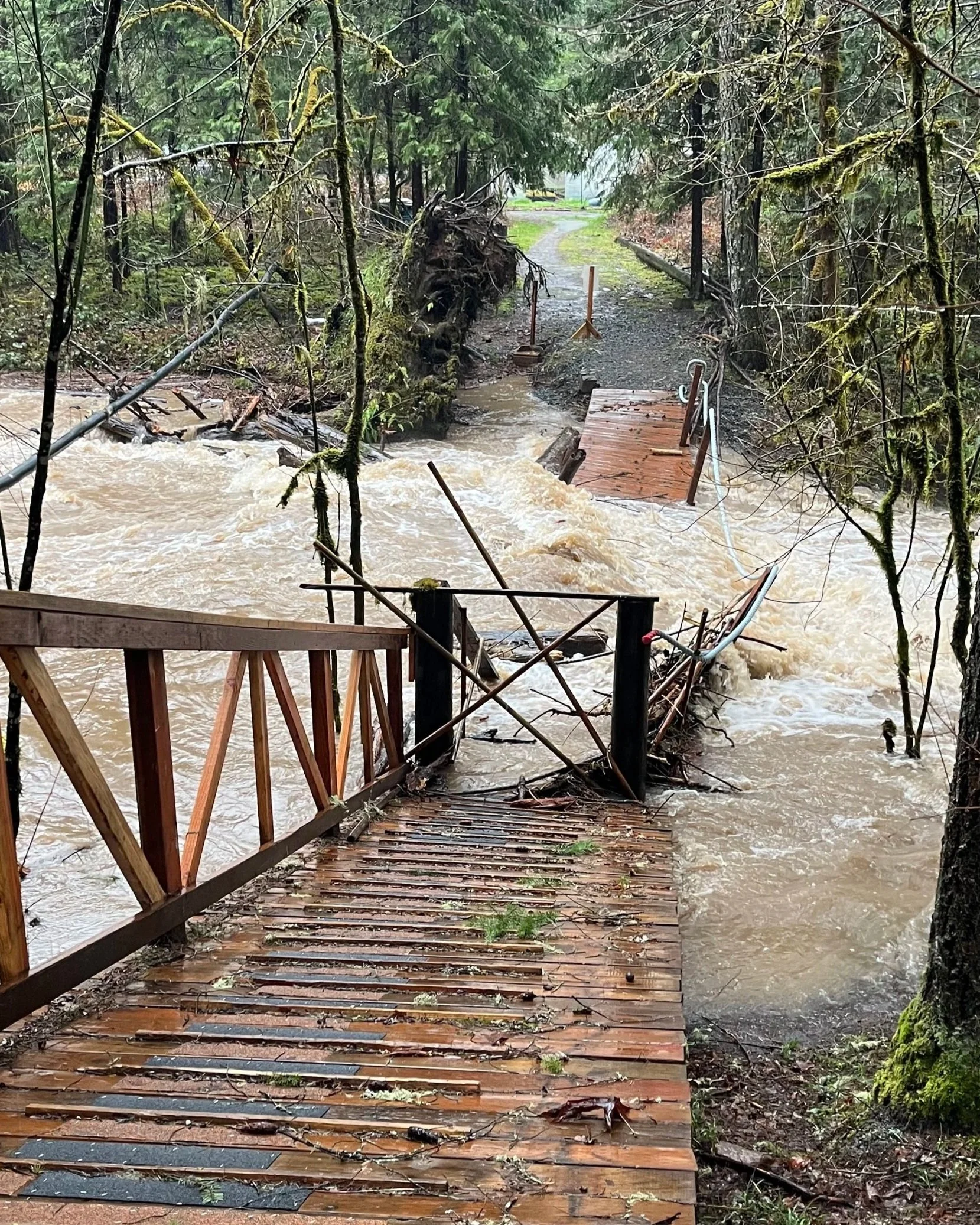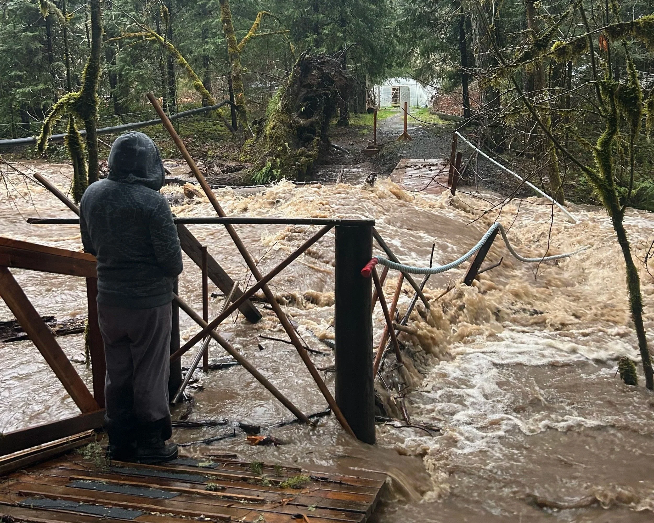 In January 2024, the Pacific Northwest was hit by an ice storm that has come to be called “Icepocalypse”. This extreme weather event resulted in the loss of our bridge that crosses Anthony Creek, when a mature douglas fir tree completely uprooted and destroyed the structure.