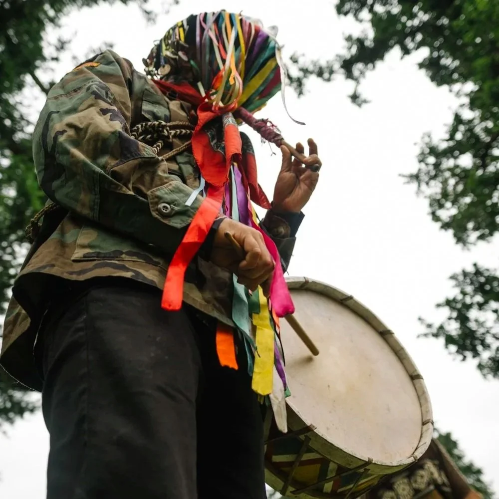 The elders from the South tell us that song, dance, story, and symbol are the basis of what it means to be a People—to share an identity that binds us to each other and to the land within concentric circles of care, reciprocity, and responsibility. Thus, to participate in communal practices of song, dance, and story is not just a matter of joy-making and entertainment, but rather essential life-sustaining threads within the re-weaving of our collective sovereignty and ancestral memory. Here within the union art and stewardship, we offer our dance as part of a greater prayer to re-weave the bond between people and place and to strengthen our community alliances in service to the regeneration of land, community, and culture.